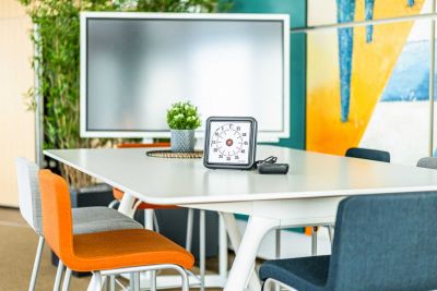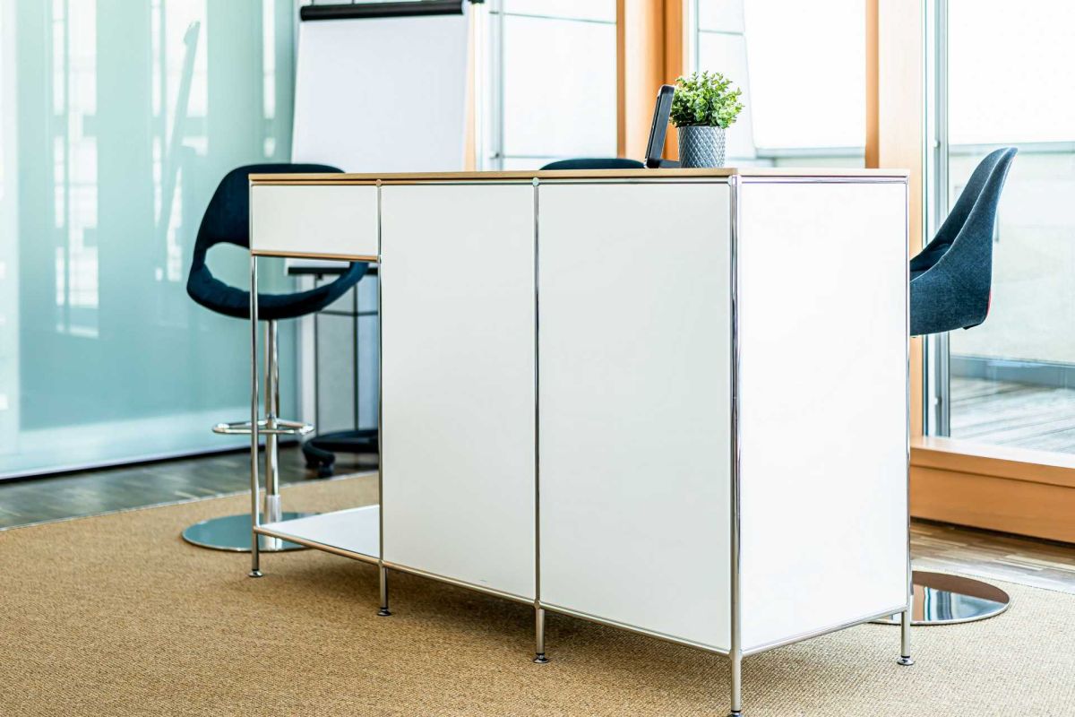 Der Sitzungssaal erscheint nun auch in modernem Design und ist flexibel nutzbar. Durch die stabilen, klappbaren Tische kann das Mobiliar von einer Konferenztischlösung einfach und schnell zu einer Schulungssituation umgebaut werden. Ideal für die sich ständig ändernden Anforderungen. Eine Hochtischkombination mit integriertem Kühlschrank ergänzt den Raum und sorgt für eine unkomplizierte Catering Lösung in unmittelbarer Nähe.
